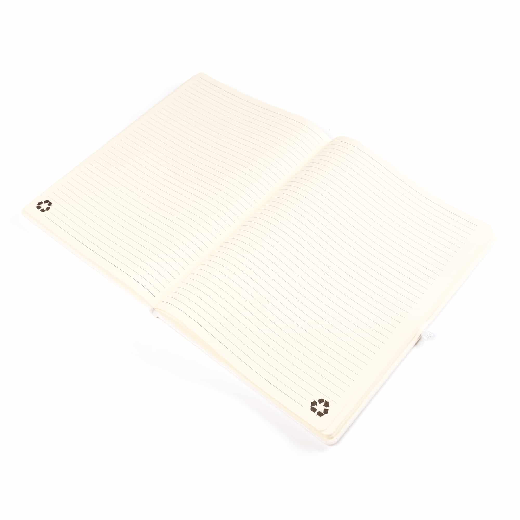A4 white PU soft finish 80 sheet lined notebook with white bookmark, back pocket, coloured elastic pen loop and elastic closure.