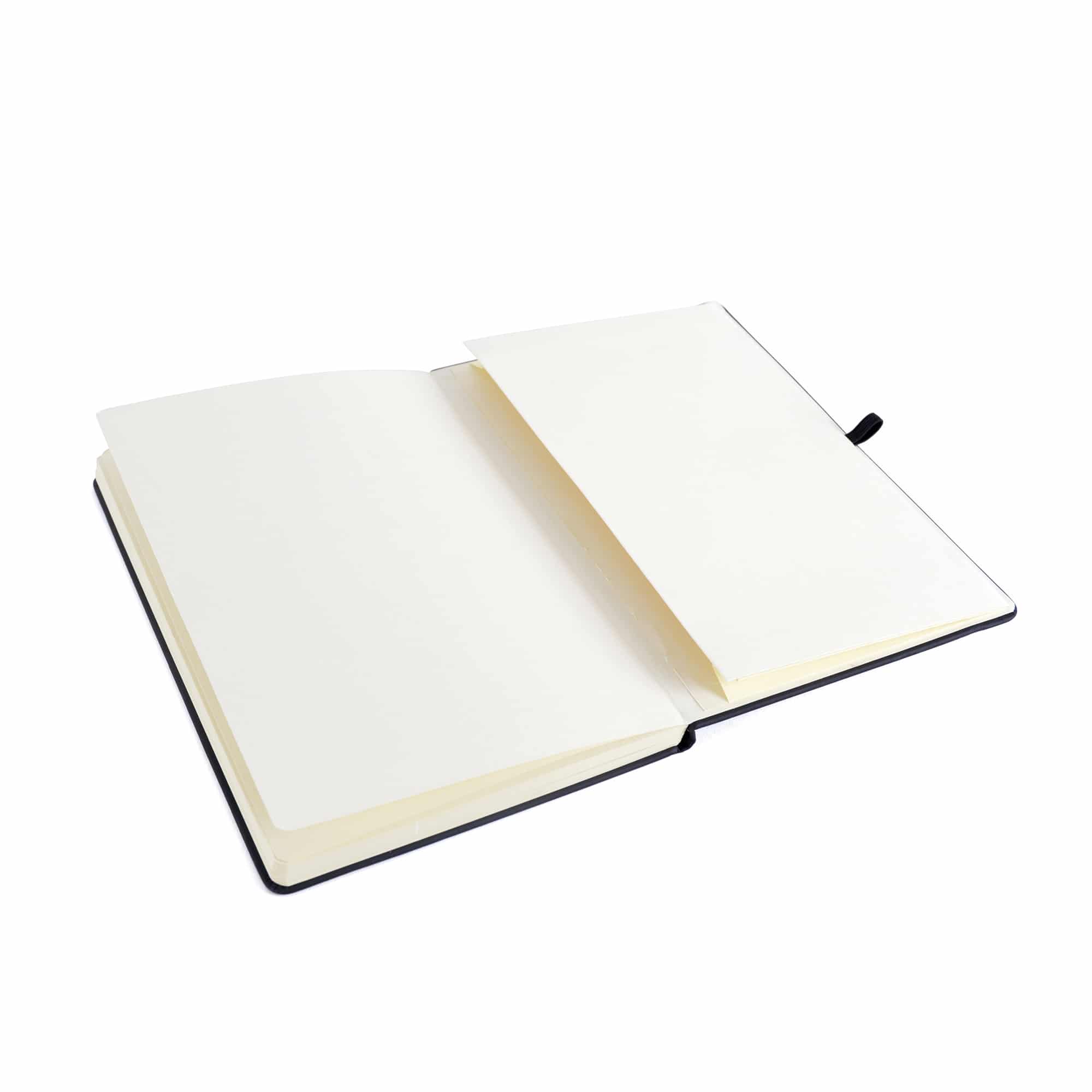 A5 black PU soft finish notebook with 80 plain sheets, coloured elastic closure, pen loop and bookmark. Back pocket to store loose notes.