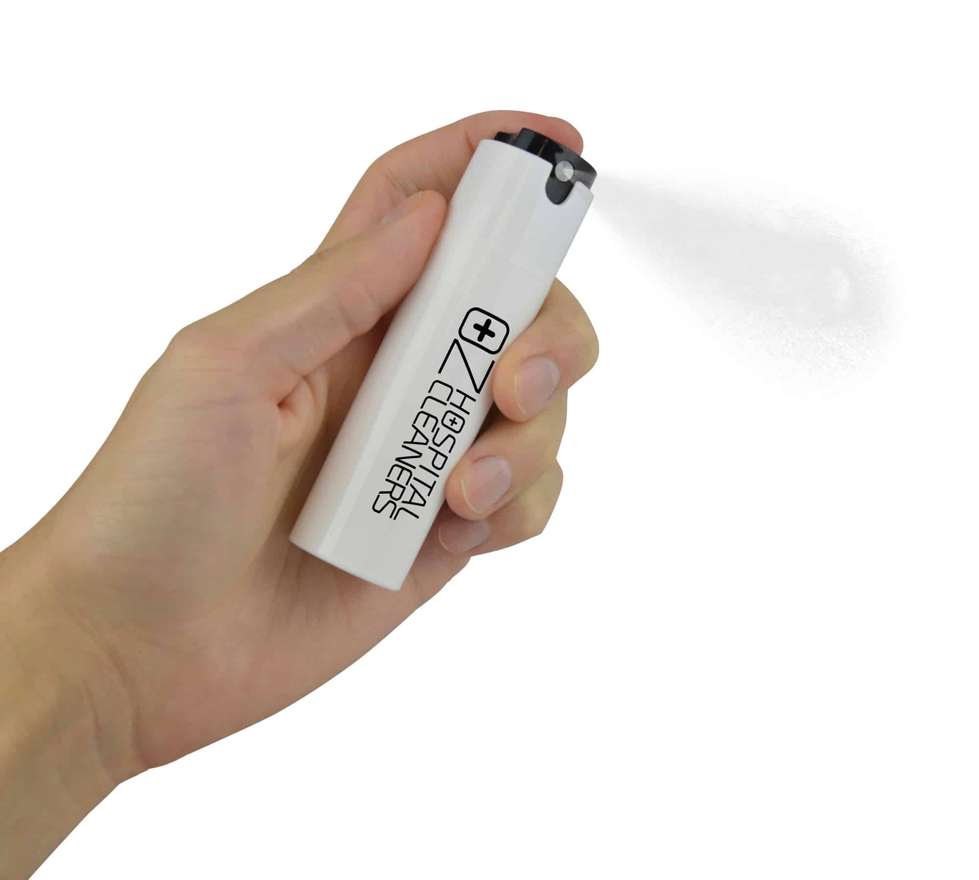 30ml pocket sized plastic cylindrical hand sanitiser spray with push button action.