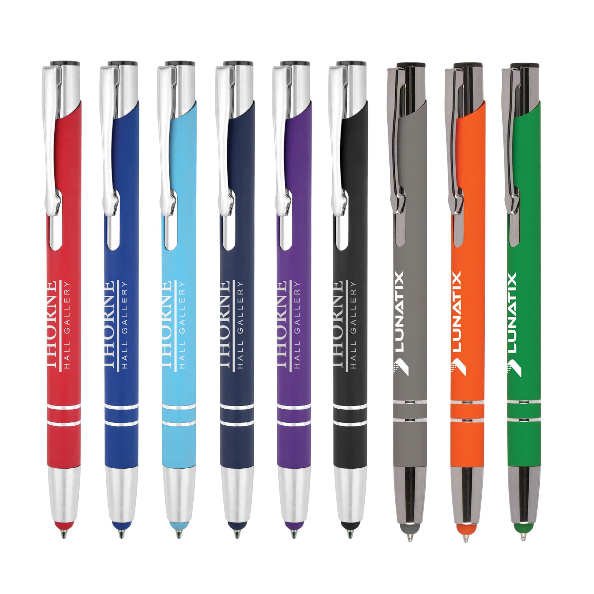 A Recycled soft feel stylus version of one of our most popular metal pens in a range of vibrant colours. Marking is by Engraving or digital print.