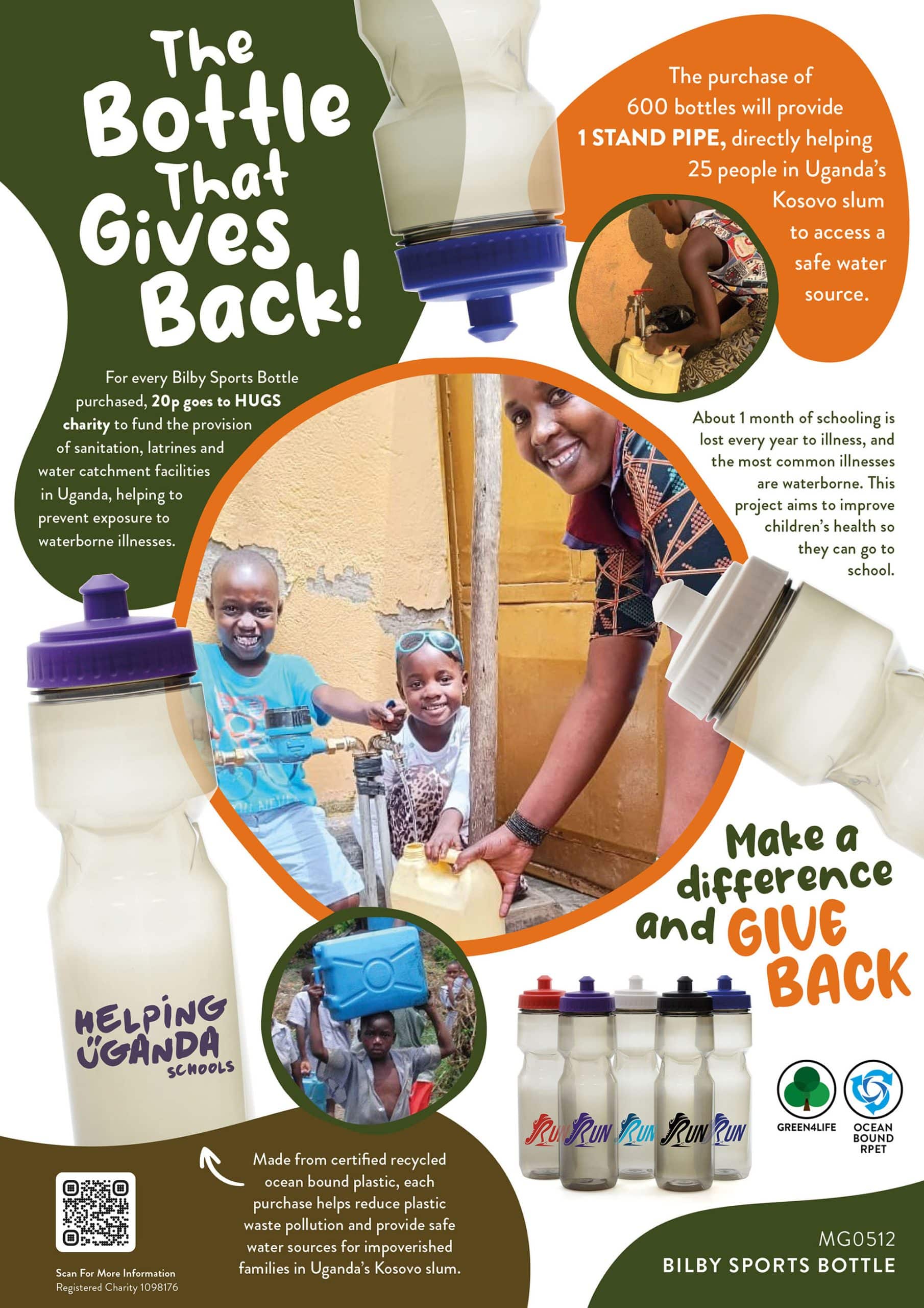 The bottle that gives back – for every Bilby Sports Bottle purchased, 20p goes to HUGS charity to provide sanitation, latrines and water catchment facilities in Uganda. 600 bottles…
