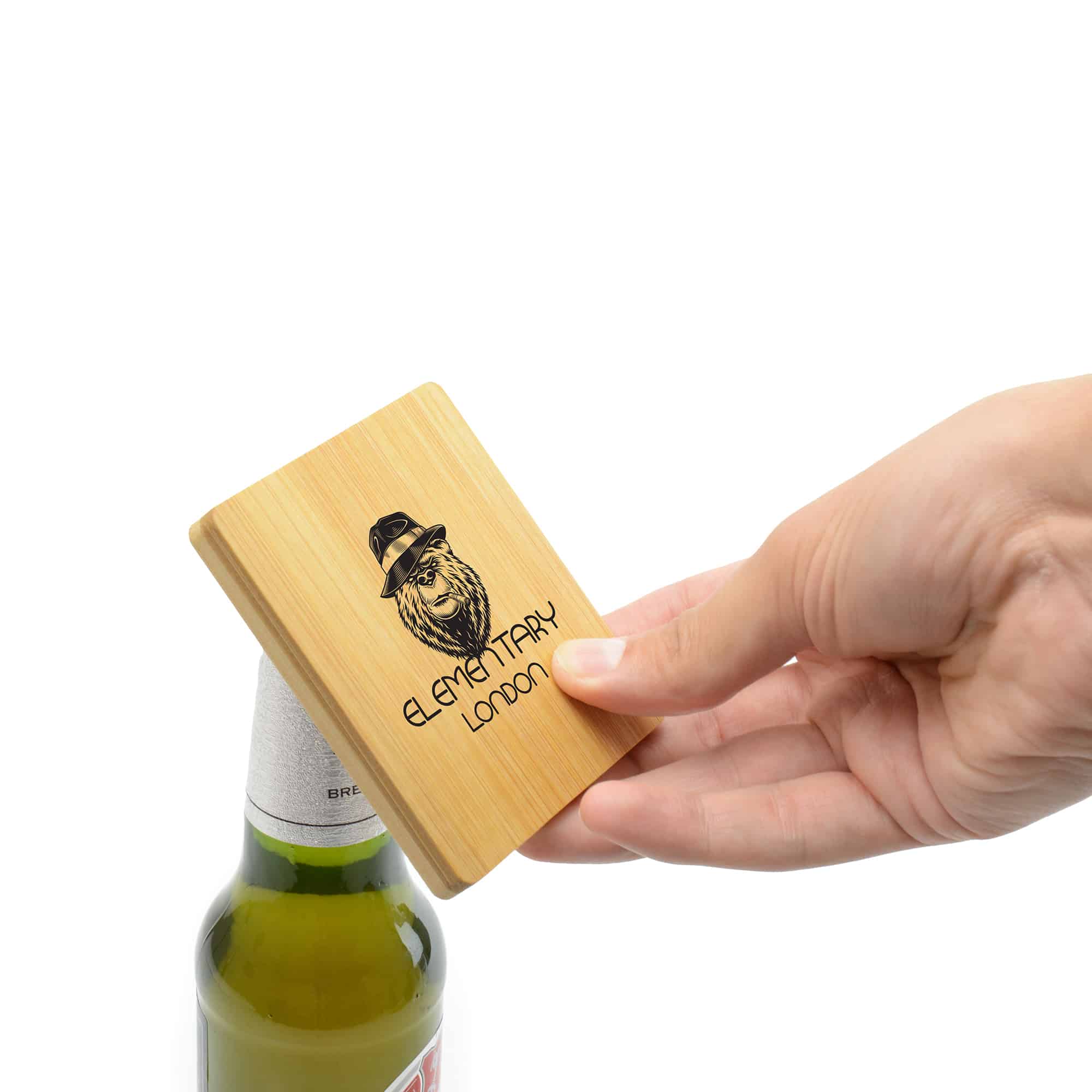 Natural bamboo 2-in-1 square coaster with a built-in iron bottle opener to keep the drinks flowing. On the desk, table or bar, the promotional coaster is a must-have product, so w…