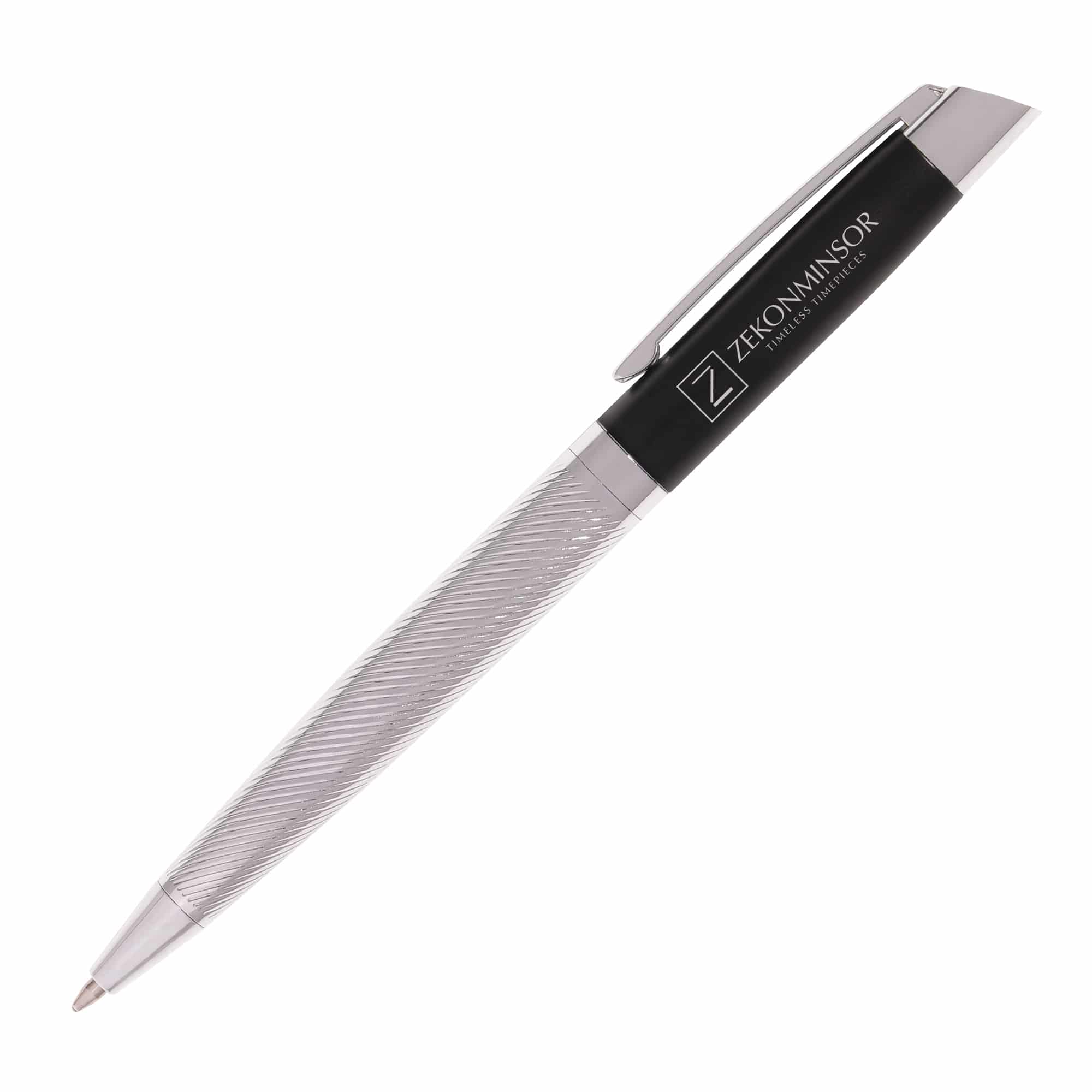 A metal twist action ball pen with a uniquely textured barrel that appears to spiral around the bottom half of the barrel in a striking chrome finish. The contrasting top section of the pen is finished in satin smooth black coating that can be engraved to reveal a stunning chrome logo design or message. The metal ‘Parker style’ refill included will ensure a long lasting, quality writing experience. When the time comes, replacement refills can be purchased for this product therefore extending its lifespan which makes it more environmentally friendly and boosts the retention of this premium branded gift. The Bonita Ball Pen oozes sophistication and makes the perfect executive gift for special customers and valued employees. This executive level pen can be presented in a number of gift boxes, contact us today to discuss your options.