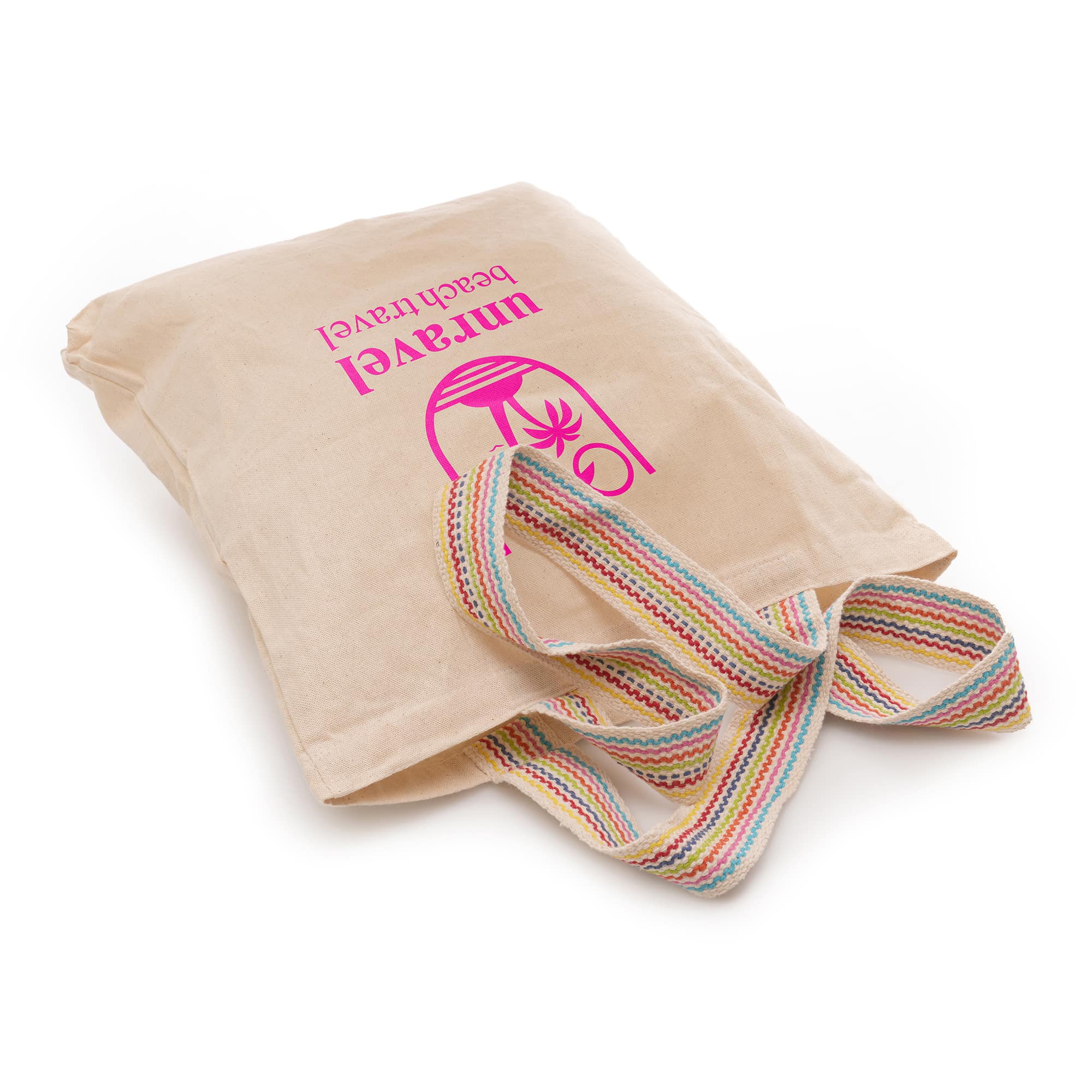 Natural coloured 6oz cotton shopper with bright rainbow striped handles.