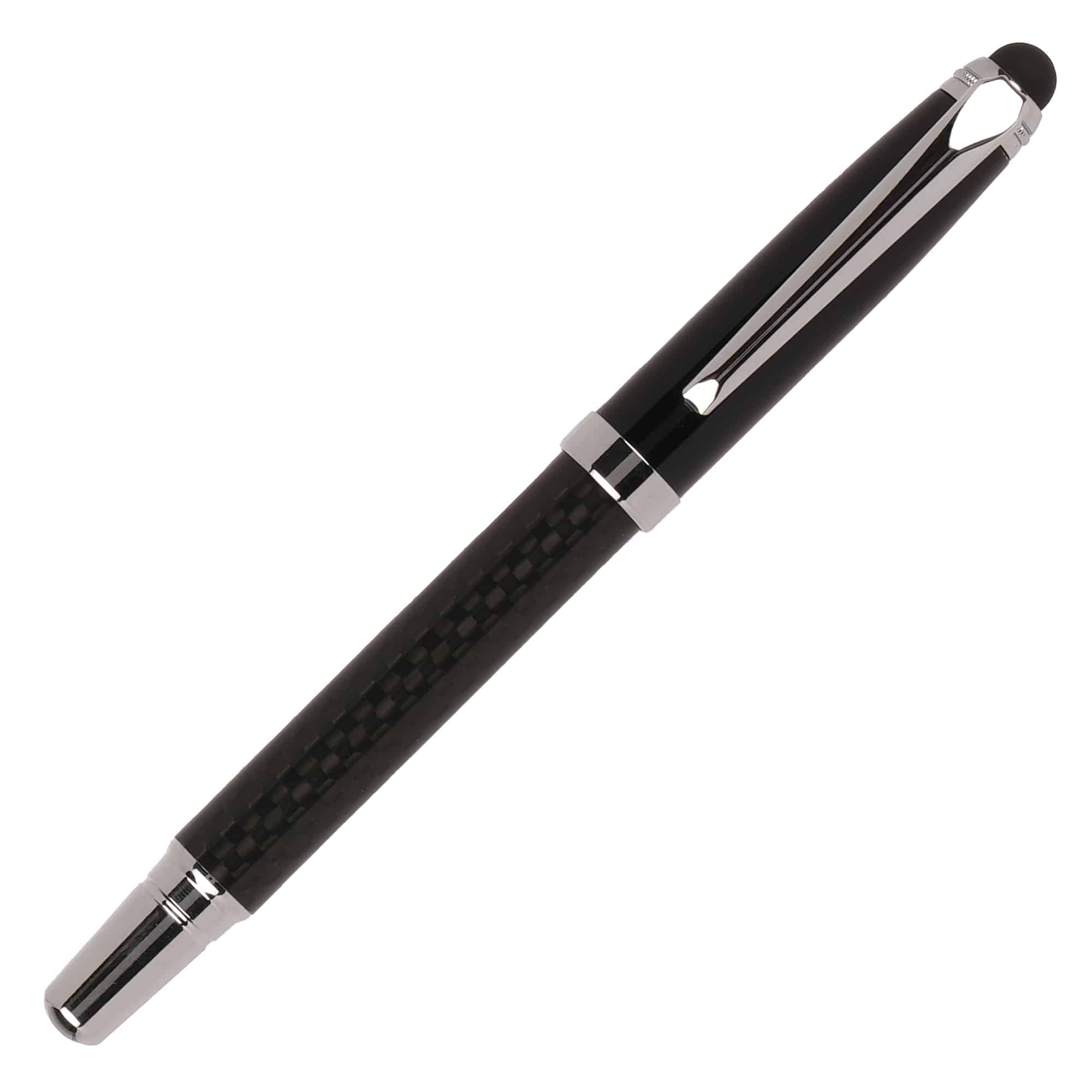The rollerball version of a much loved best-selling ball pen! A high quality rollerball pen featuring a stunning carbon fibre barrel, which is certain to bring the wow factor. The carbon fibre barrel showcases the real quality and high end nature of this promotional pen. There won’t be a better way to advertise your brand than having it feature on a stunning carbon fibre rollerball pen. The cap of the pen is undercoated chrome, so when engraved, it shows through a breath-taking mirror chrome finish. Not only does this pen have striking looks, it is also practical. The pen features a rubber stylus that is perfect for navigating touch screen devices, meaning that your device is smudge-free. This makes it the perfect executive gift for high valued employees and special customers. It can even be paired with the ball pen and a gift box to make a premium branded gift set. Contact us today to discuss your options.