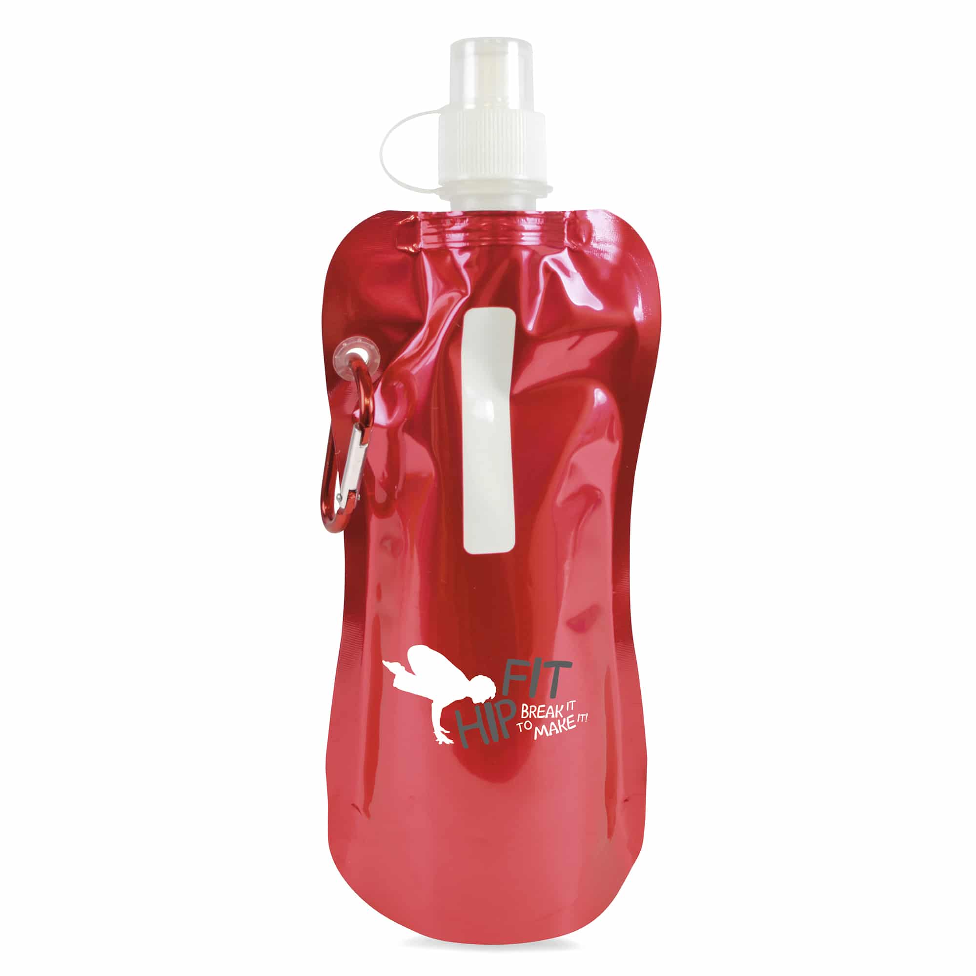 400ml metallic single walled mixed plastic (PA, PE and PET) and aluminium reusable roll up sports bottle with matching coloured carabiner. BPA & PVC free.