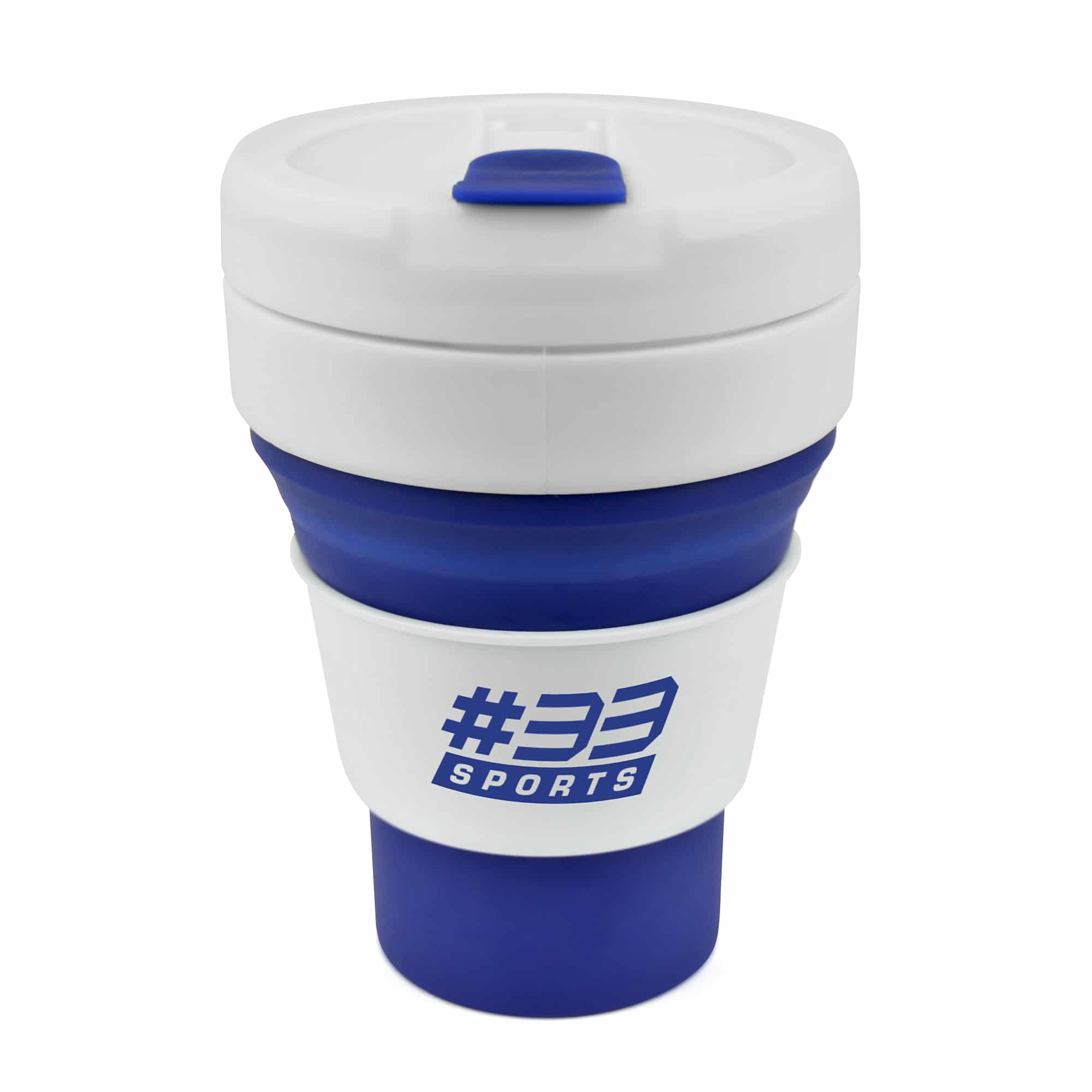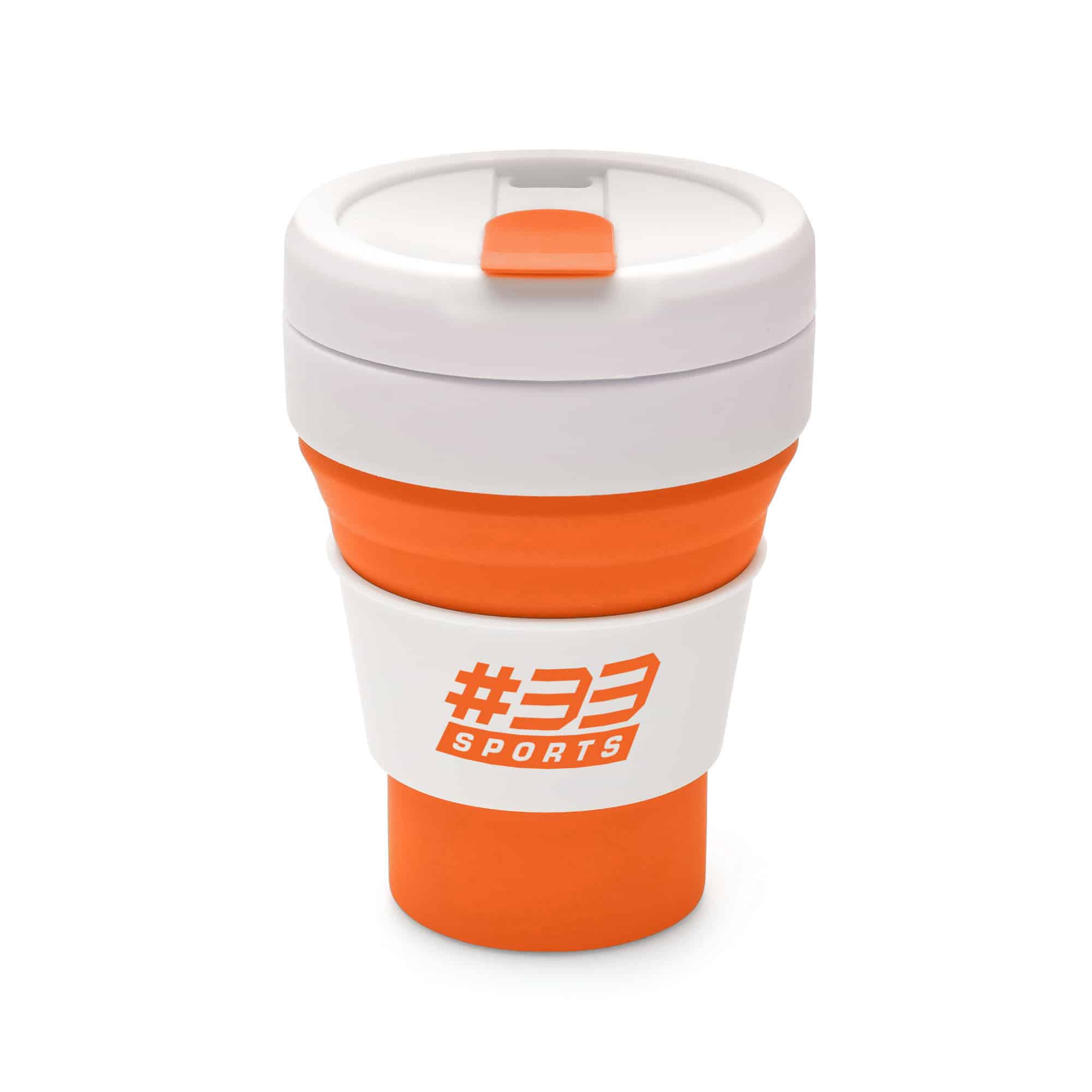 355ml single walled, collapsible cup with black silicone body, white PP plastic heat sleeve, trim and secure screw top lid with sipper. BPA & PVC free.