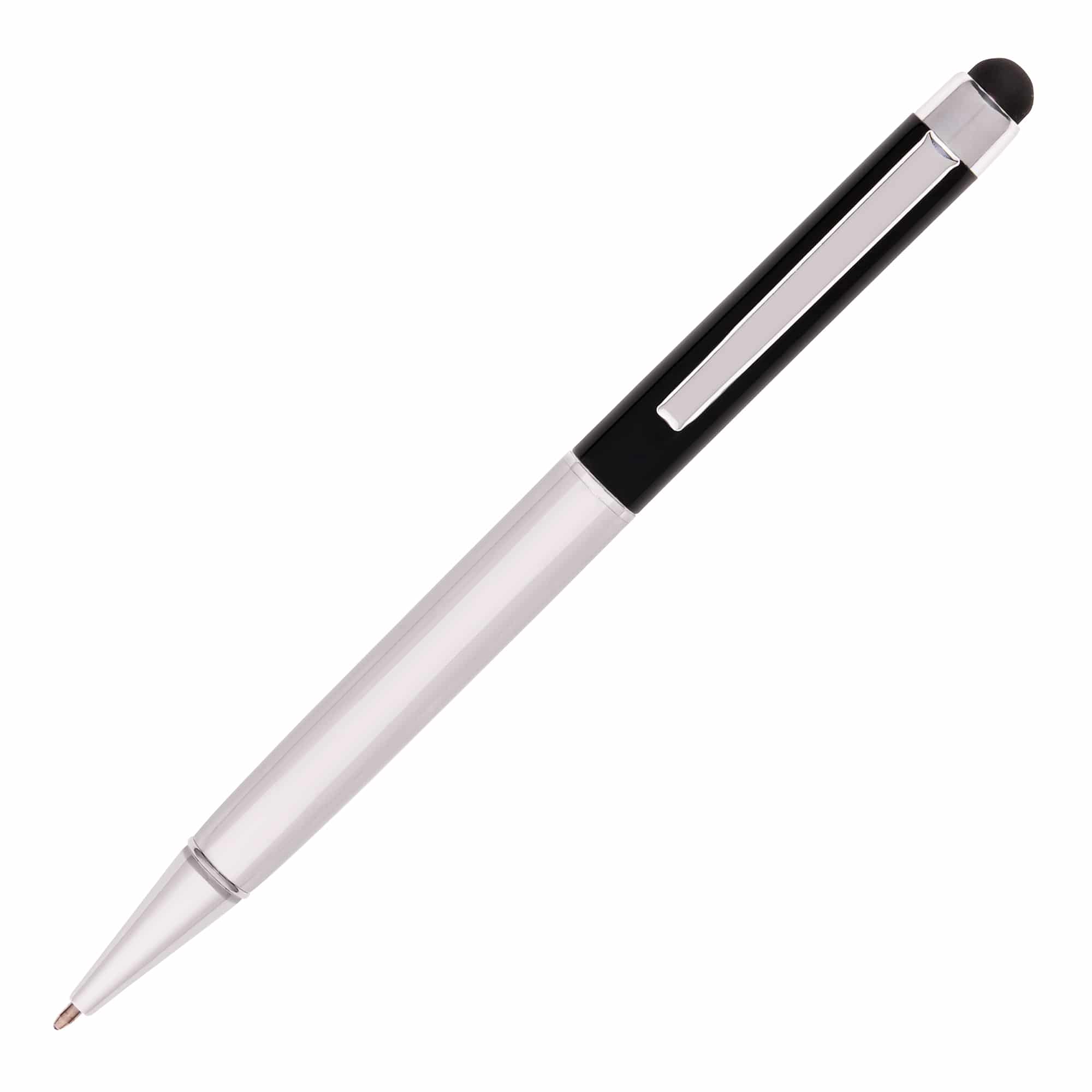 The Harris Stylus Pen is a metal twist action ball pen with a striking two-tone barrel. The bottom half of the pen is finished in a high shine chrome and the top half can be supplied in black or white. The high shine trims add the finishing touches to this useful, dual-purpose pen. The stylus end piece is particularly useful in public spaces as it prevents the user from having to touch screens with their fingertips that may be germ contaminated. It is also great for everyday use on smart phones, tablets and other devices. Choose this stylish and smart promotional item for your marketing campaign to make a great impression with new and existing clients – it makes a great business showpiece and can be customised with your brand logo or message. Place your order today and start reaping the rewards of branded merchandise at its best.