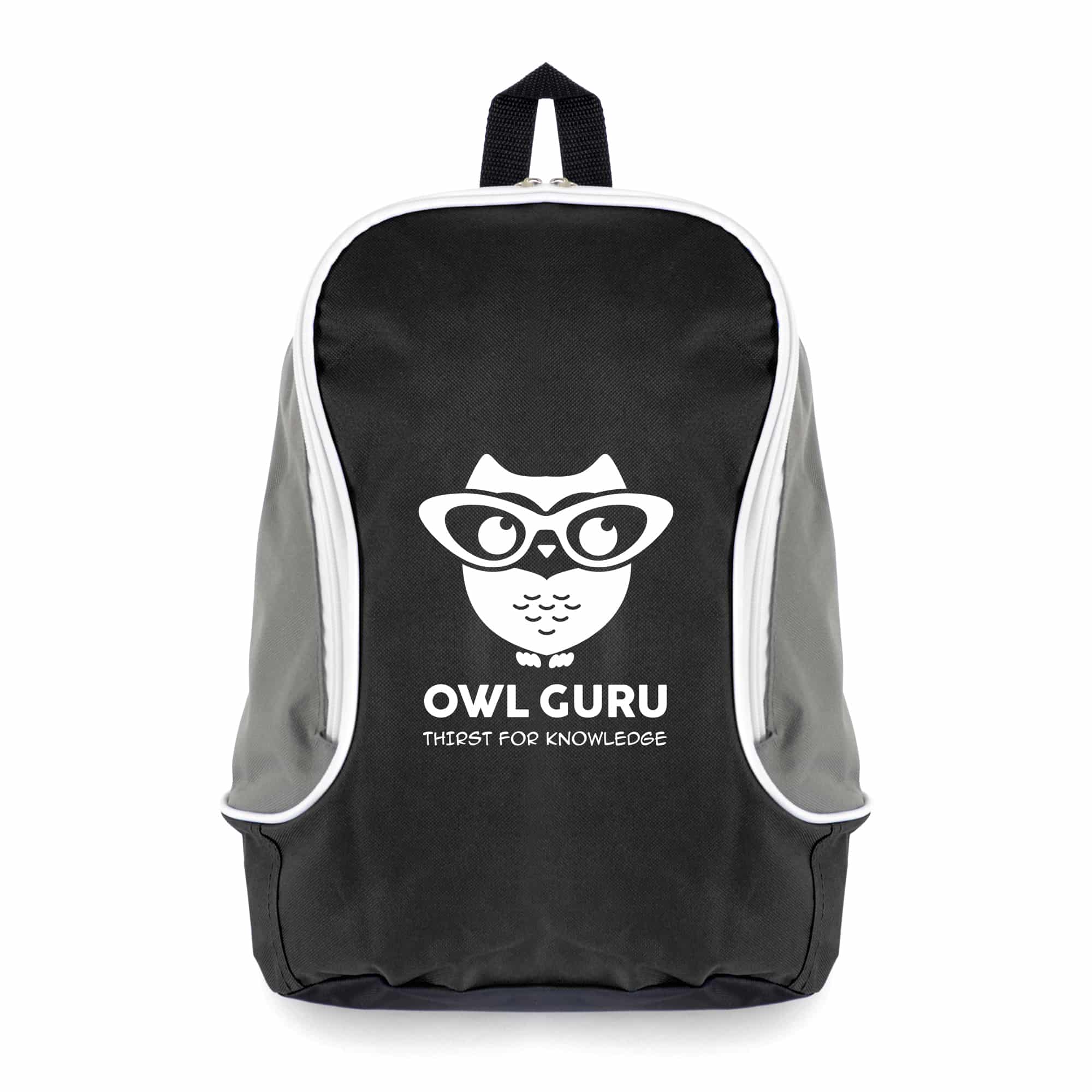 600D Polyester rucksack with a coloured feature, shoulder straps, grey backing, white trim and black base.