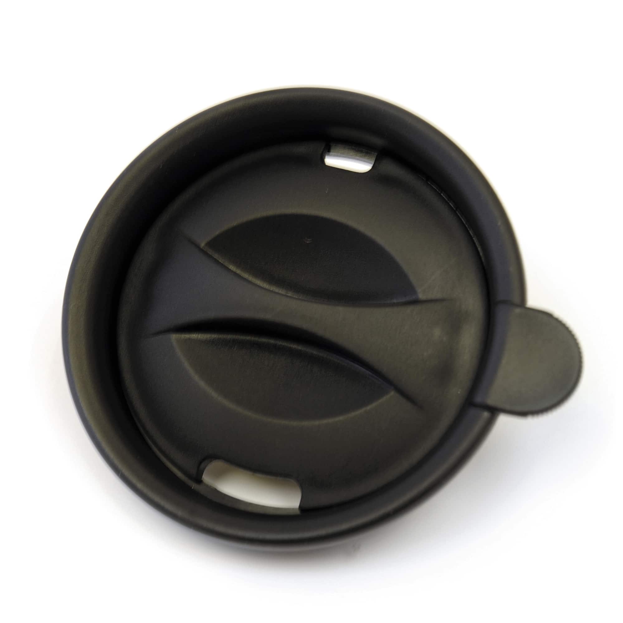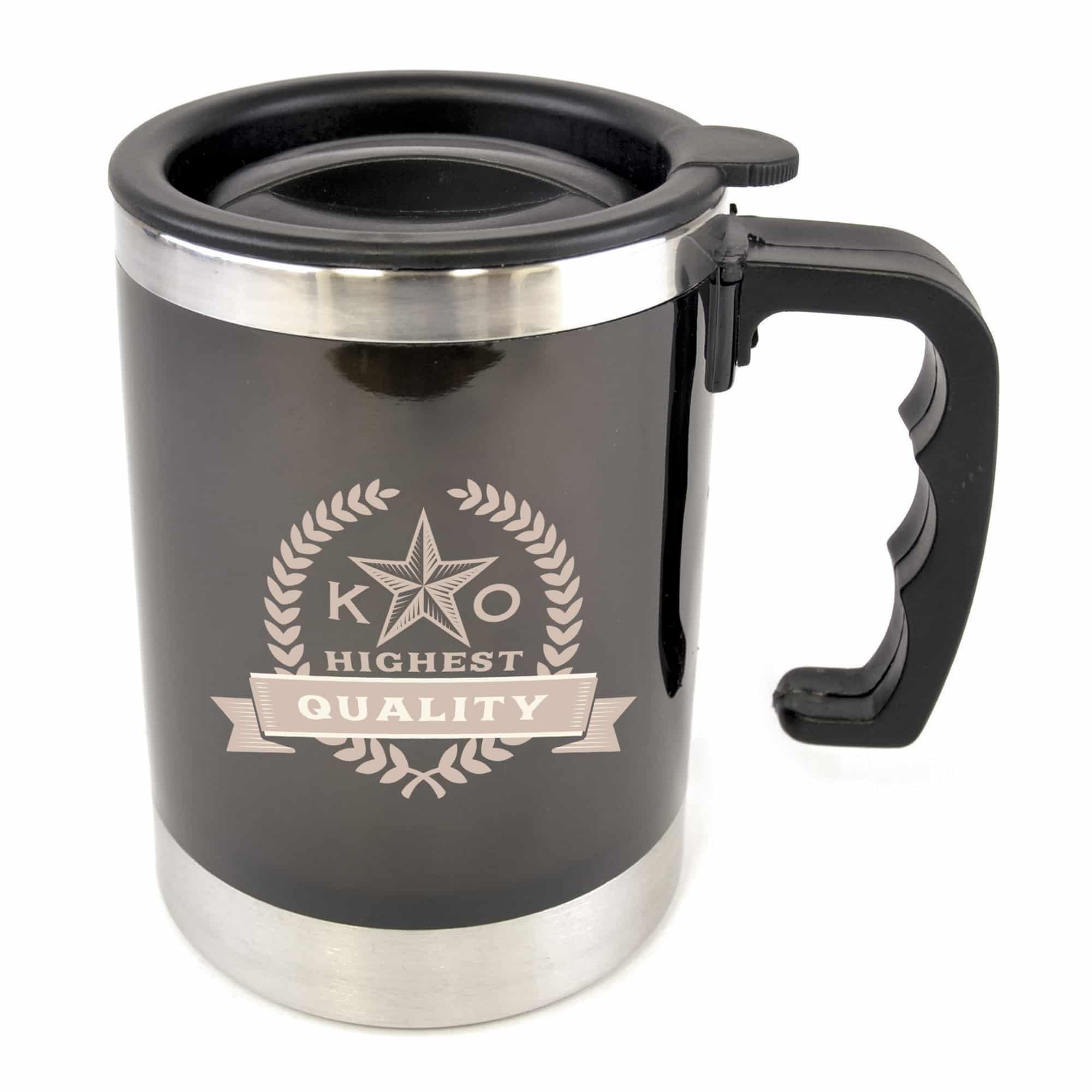 400ml double walled, cylindrical shaped, AS plastic travel mug with stainless steel interior, black push on lid and black handle. BPA & PVC free.