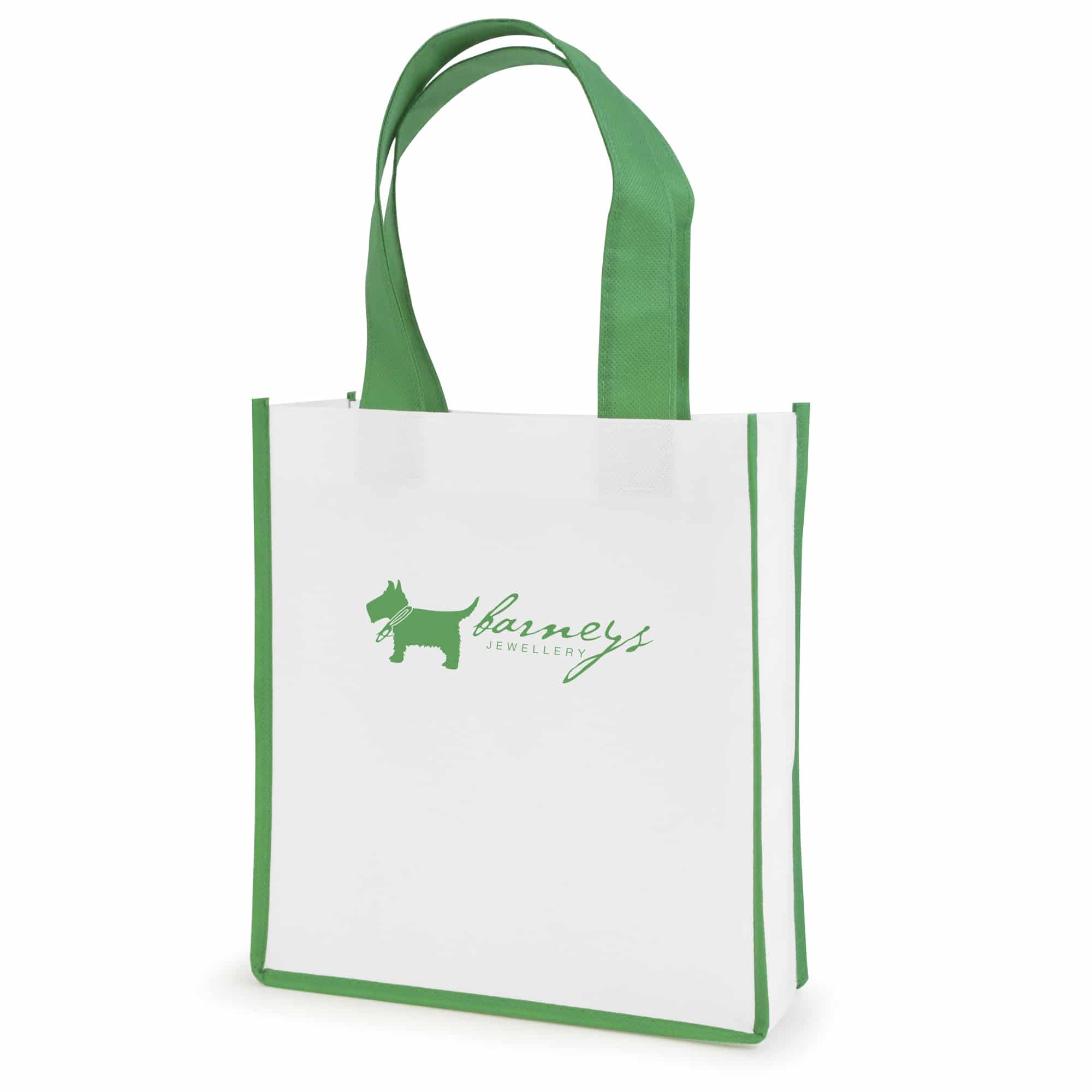 Recyclable 80gsm non woven PP mini shopper with gusset and coloured handles to match the edge trim
