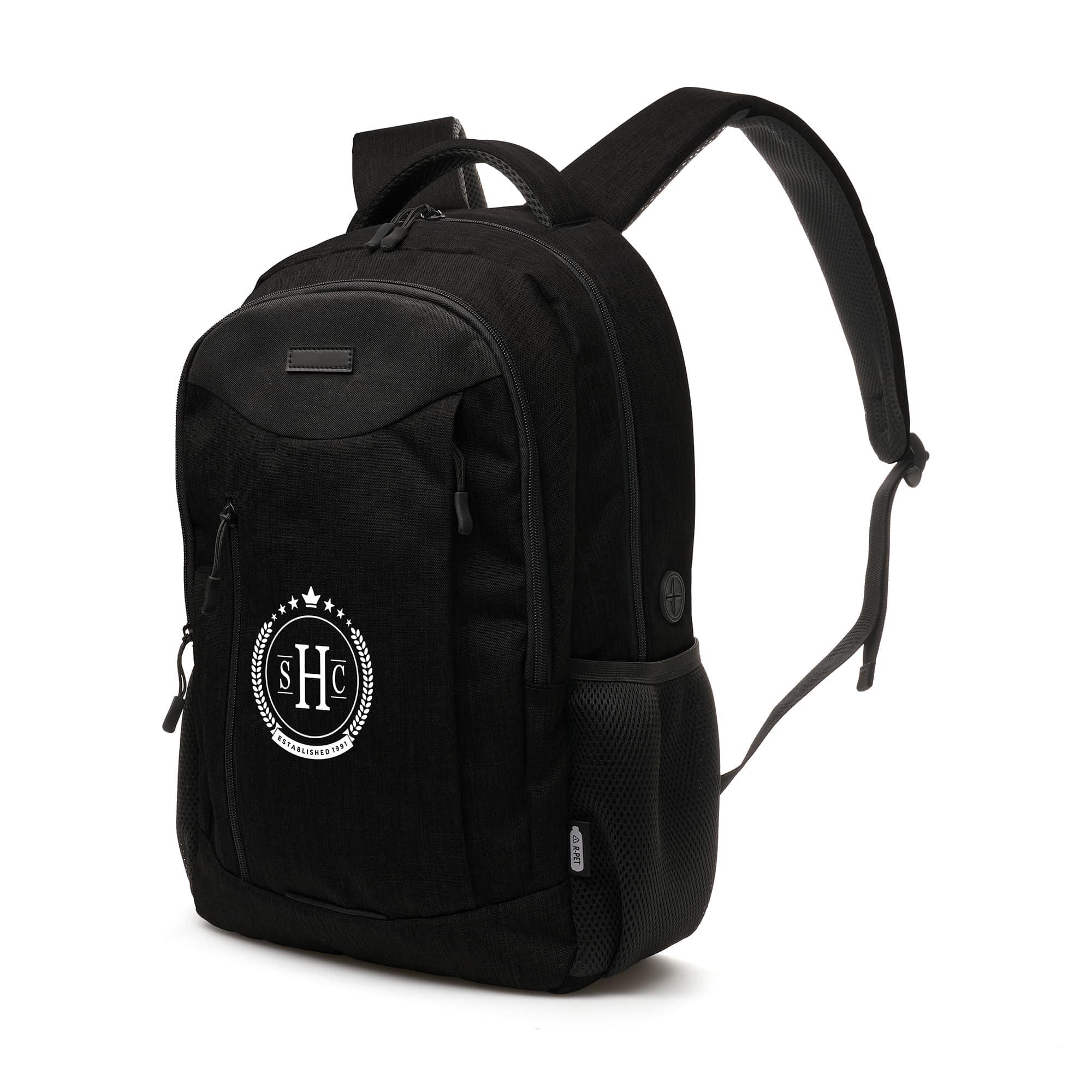 Introducing this premium modern backpack, crafted with care and attention. Made from RPET (recycled PET plastic), featuring a small zip compartment to front, two main compartment with padded laptop pocket, two side pockets, metal puller and nylon zipper for durable operation. Padded adjustable shoulder straps and luggage strap for on the go convenience. Customise this backpack with your company logo, turning it into a walking advertisement for your business. An ideal giveaway for events, tradeshows and promotions, ensuring maximum exposure for your brand. Not only is this backpack perfect for schools, where students can carry their books and laptops, but it’s also an excellent choice for your team and professionals on the go. Let’s not forget about those who travel a lot – this backpack is designed to effortlessly accompany your customers or staff on all adventures, keeping belongings secure and organised. Elevate everyday with promotional modern backpack. Experience the perfect blend of style and functionality. Get yours today and make a statement on the go. Order yours now! Bag capacity: 24.6L.