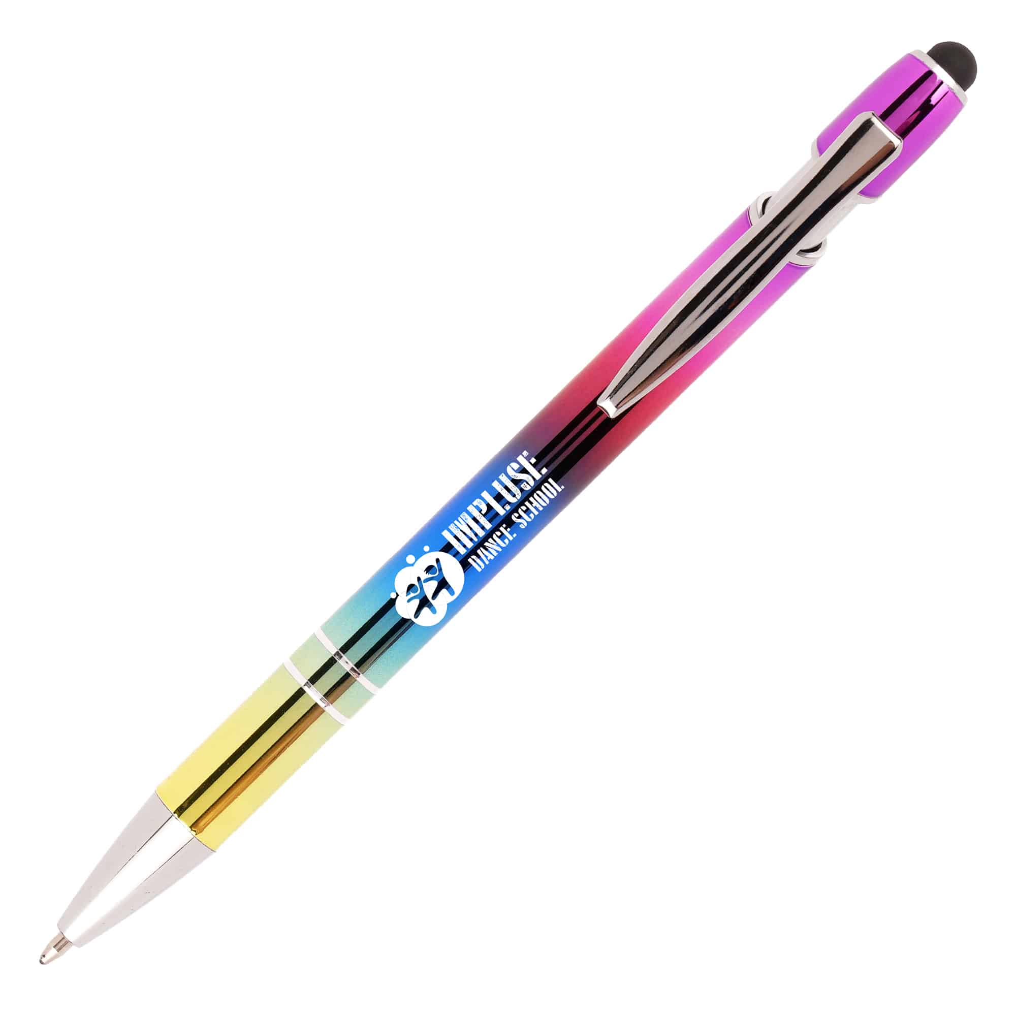 This push action promotional ball pen is now available in a rainbow version of a much loved best-selling product! Stand out from the crowd with this vibrant new design which is certain to bring attention to your brand. The glossy finish of the rainbow is eye-catching, making it the perfect promotional product for an exhibition or any corporate event. Not only is this product eye-catching, it is also unique as it has a practical function. The rubber stylus provides effortless navigation on touch screen devices, whilst also keeping the screen on your device smudge-free. This promotional pen is perfect for advertising your brand whilst being a vibrant, yet practical promotional product. Put your brand centre stage and order today.