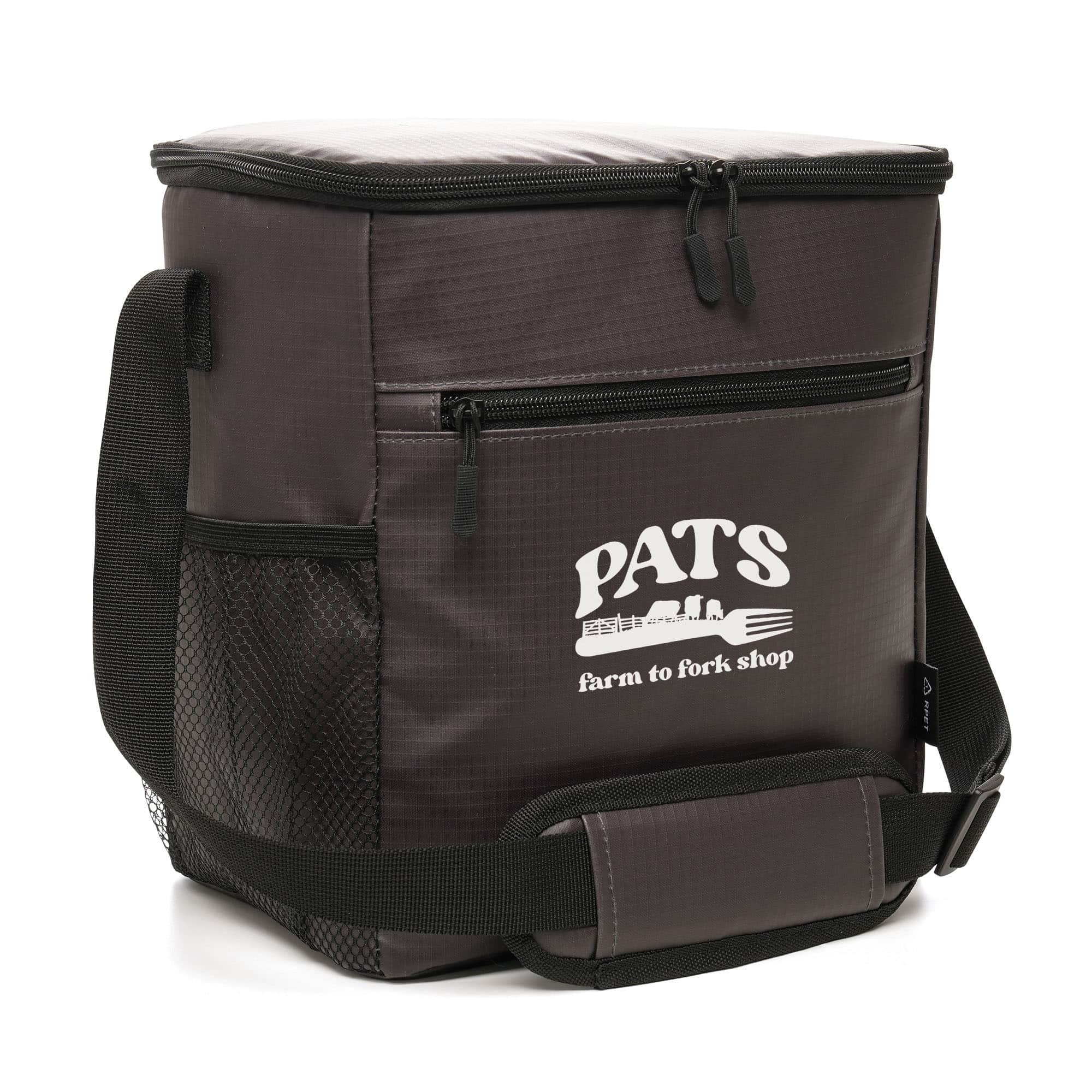 Promote your company with this premium RPET Cooler Bag. Featuring an adjustable padded shoulder strap, a mesh side pocket and a front zip compartment. Ideal for keeping your food and beverages cool, such as sandwiches and drink cans. Crafted with RPET recycled plastic materials, this stylish and sleek bag can be repurposed, making it a perfect choice for giveaways. Take advantage of its large branding area to showcase your company’s logo at trade shows, events and conferences. Show off your ample branding space and order today!