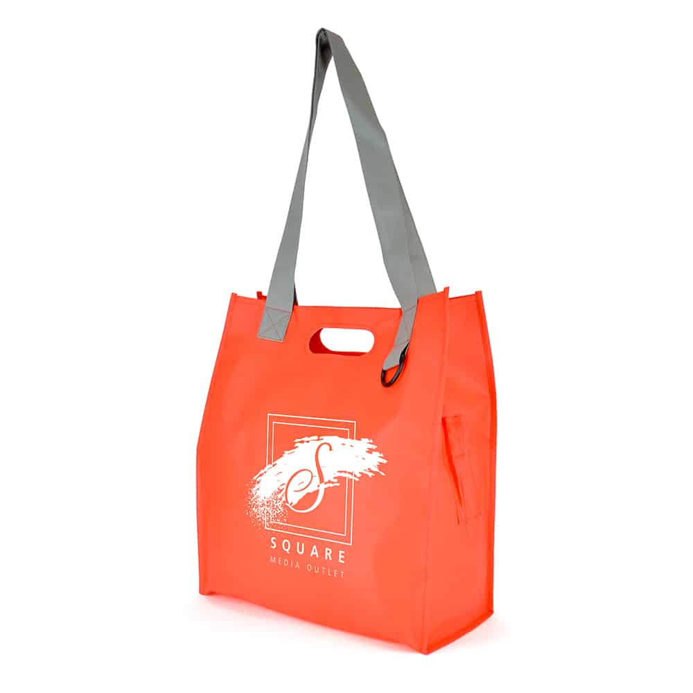 Recycled 80gsm non woven shopper with long grey handles, integrated carry handles and ring attachment.